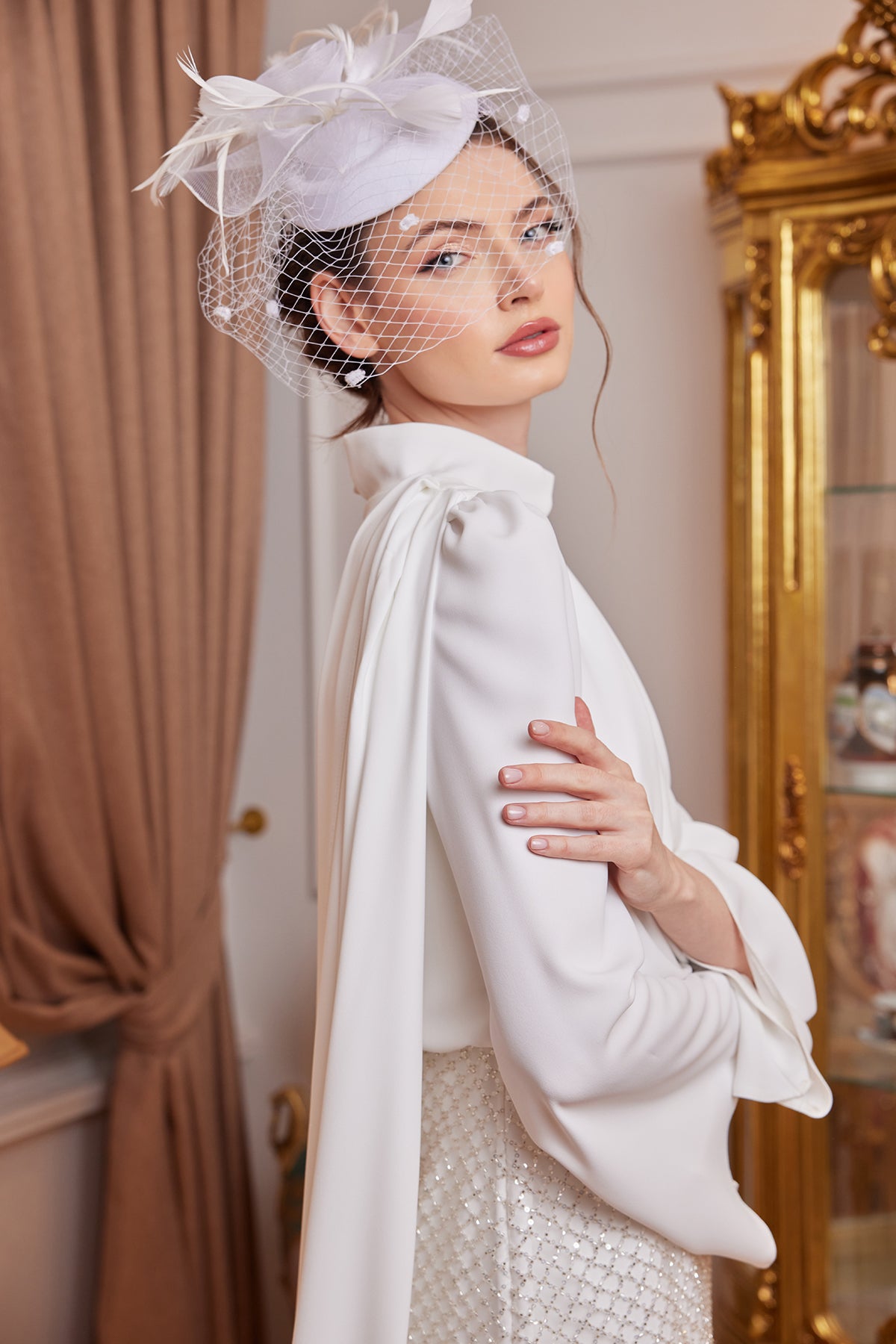 Abiyenin yaşayan özel kalıbı, vücut hatlarını yumuşak bir akışla sararken belden aşağı uzanan formu siluete zarif bir denge kazandırır. Üst bölümde yer alan akıcı drape detayları ve omuzdan arkaya doğru dökülen pelerin formu, tasarıma couture bir karakter katar. Etek kısmındaki el emeği işlemeler, ışığı incelikle yansıtarak her adımda zarafeti ön plana çıkarır.