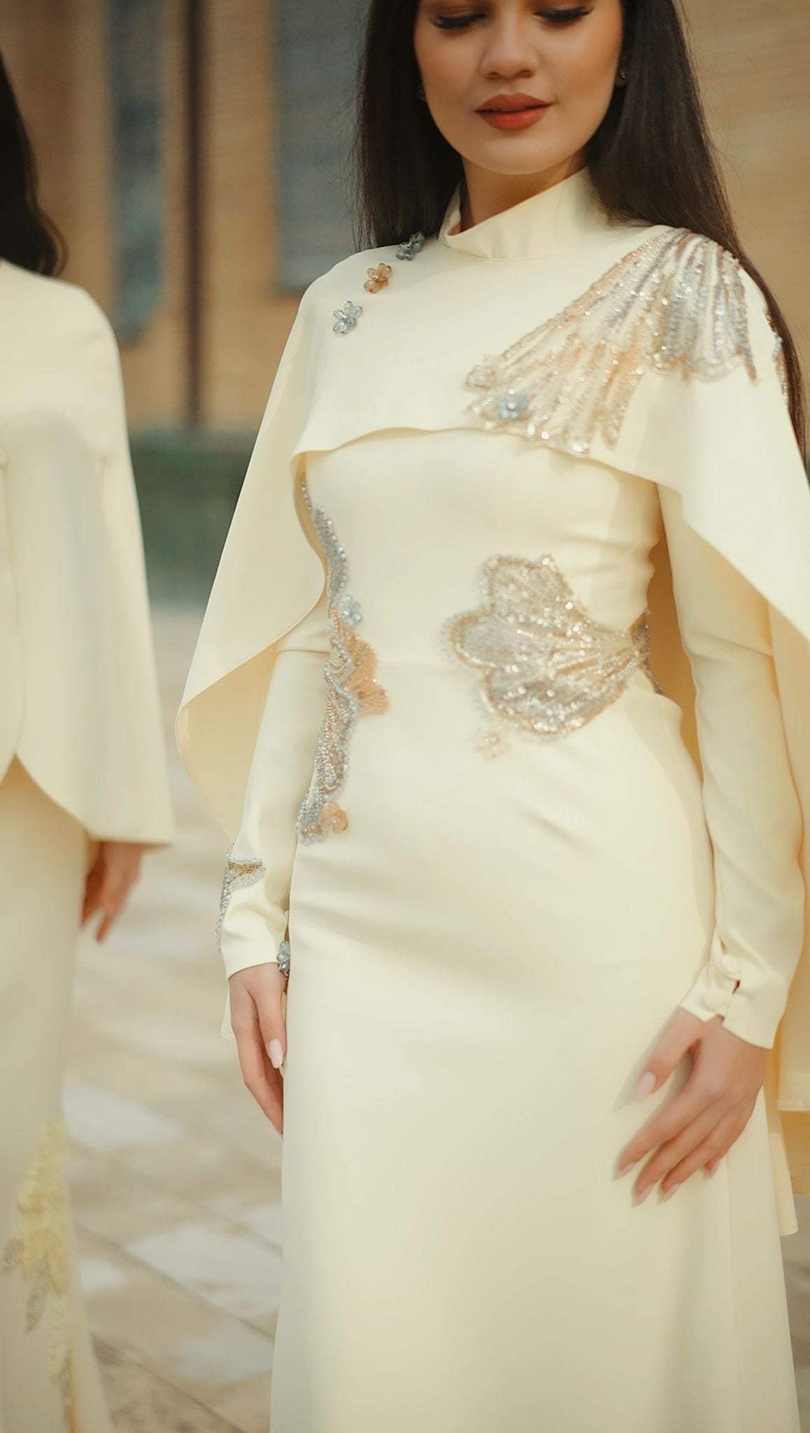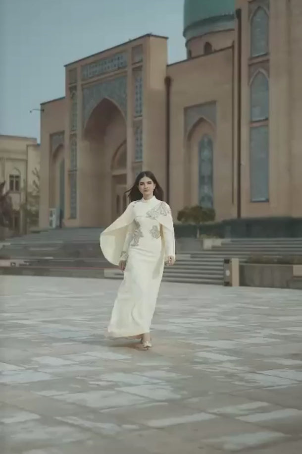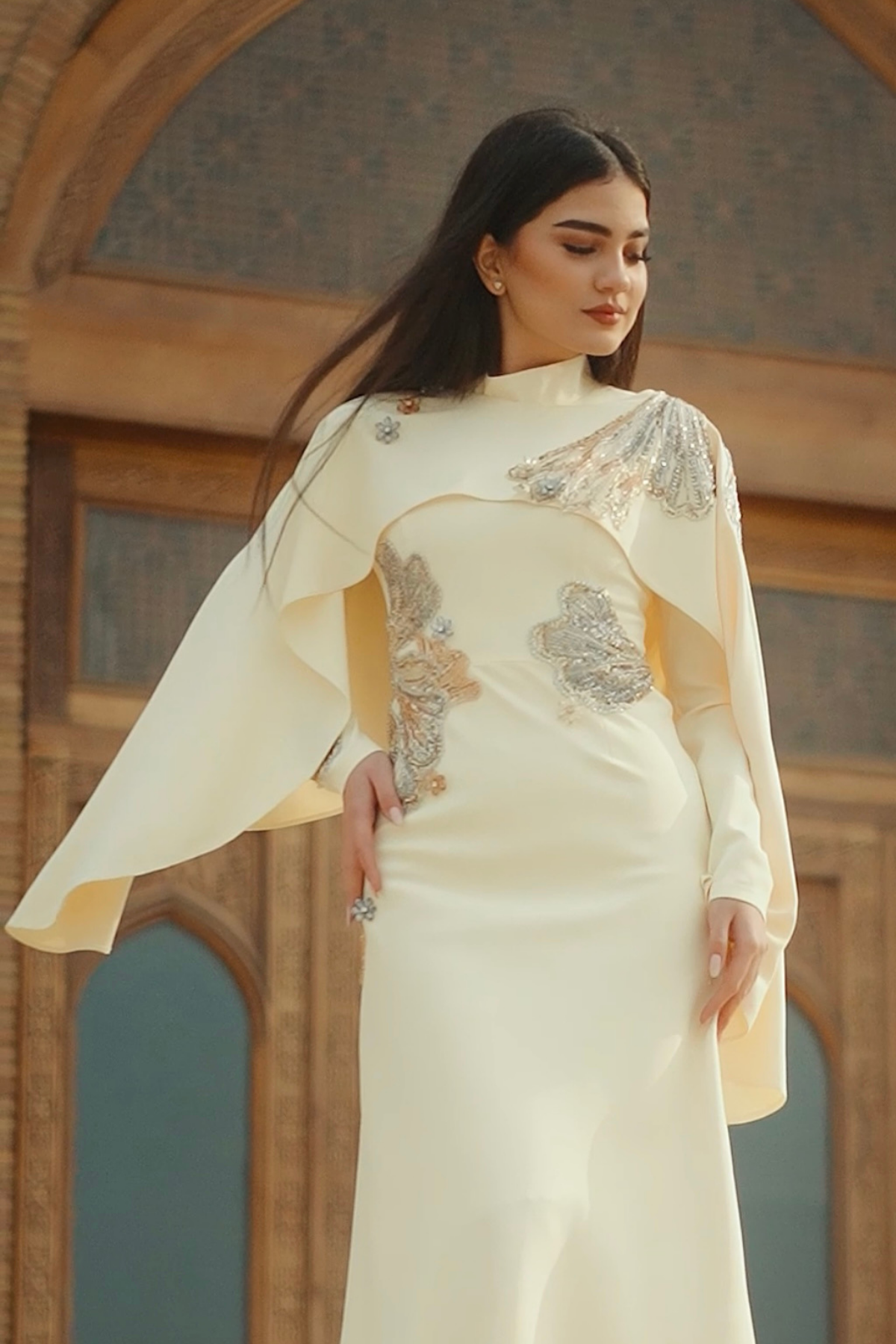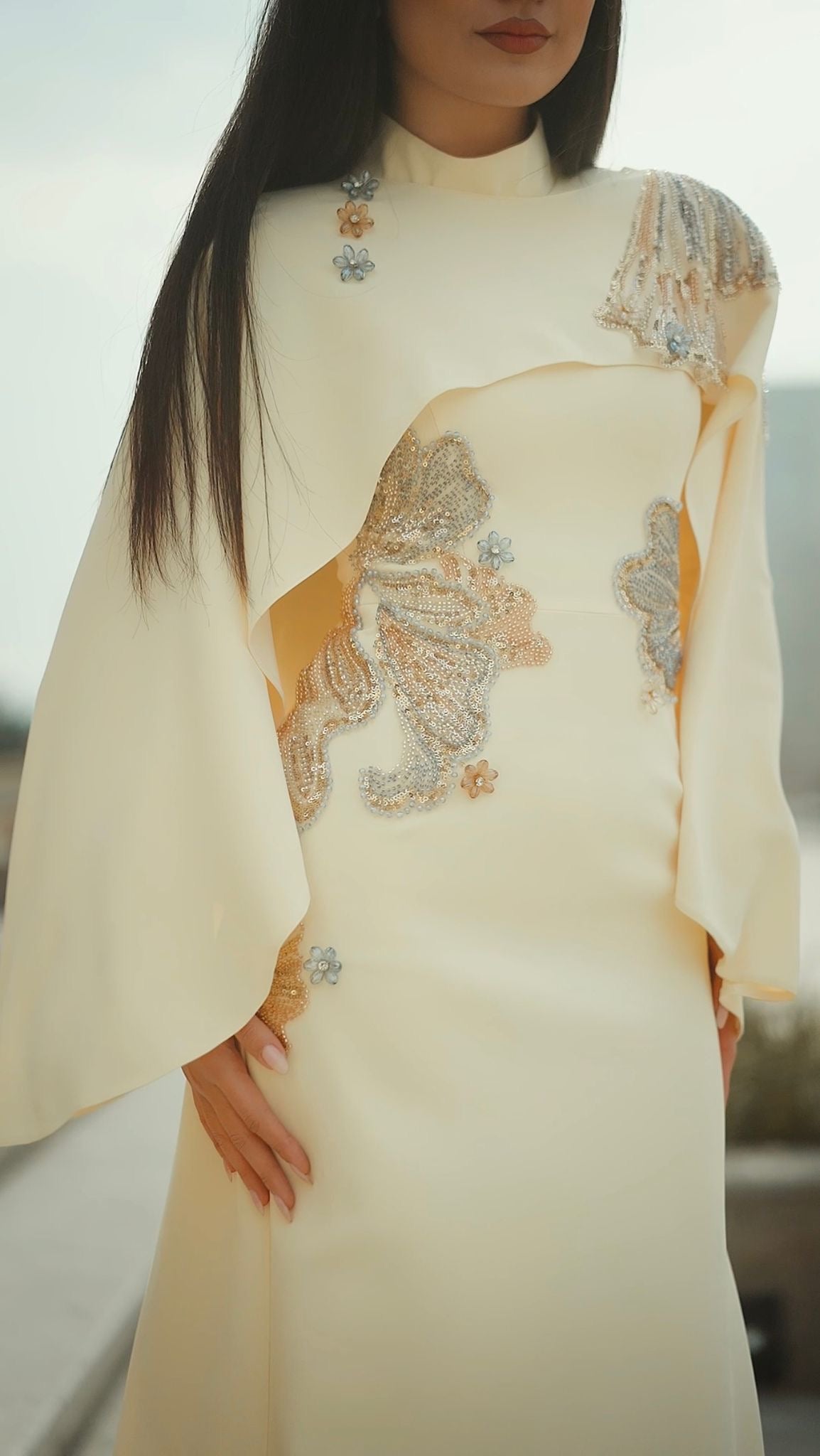 Vücuda kusursuz uyum sağlayan özel kalıbı sayesinde feminen hatları zarifçe ortaya çıkaran Canan Abiye, akıcı ve premium kumaşıyla gün boyu konfor sunar. Yüksek yaka formu ve uzun etek kesimi, açık sarı rengin zarafetiyle birleşerek tasarımı hem modern hem de zamansız bir görünüme taşır. İnce işçilikle uygulanan işlemeler, elbiseyi couture bir duruşa kavuşturur.