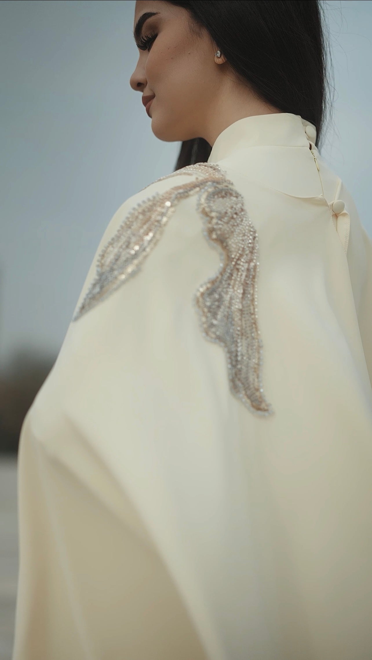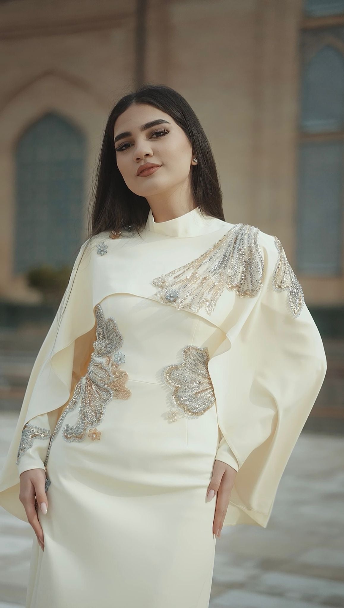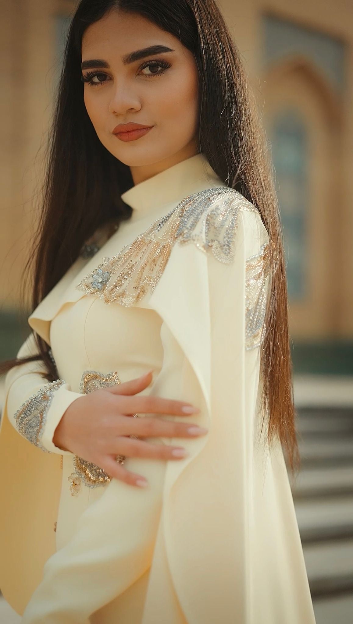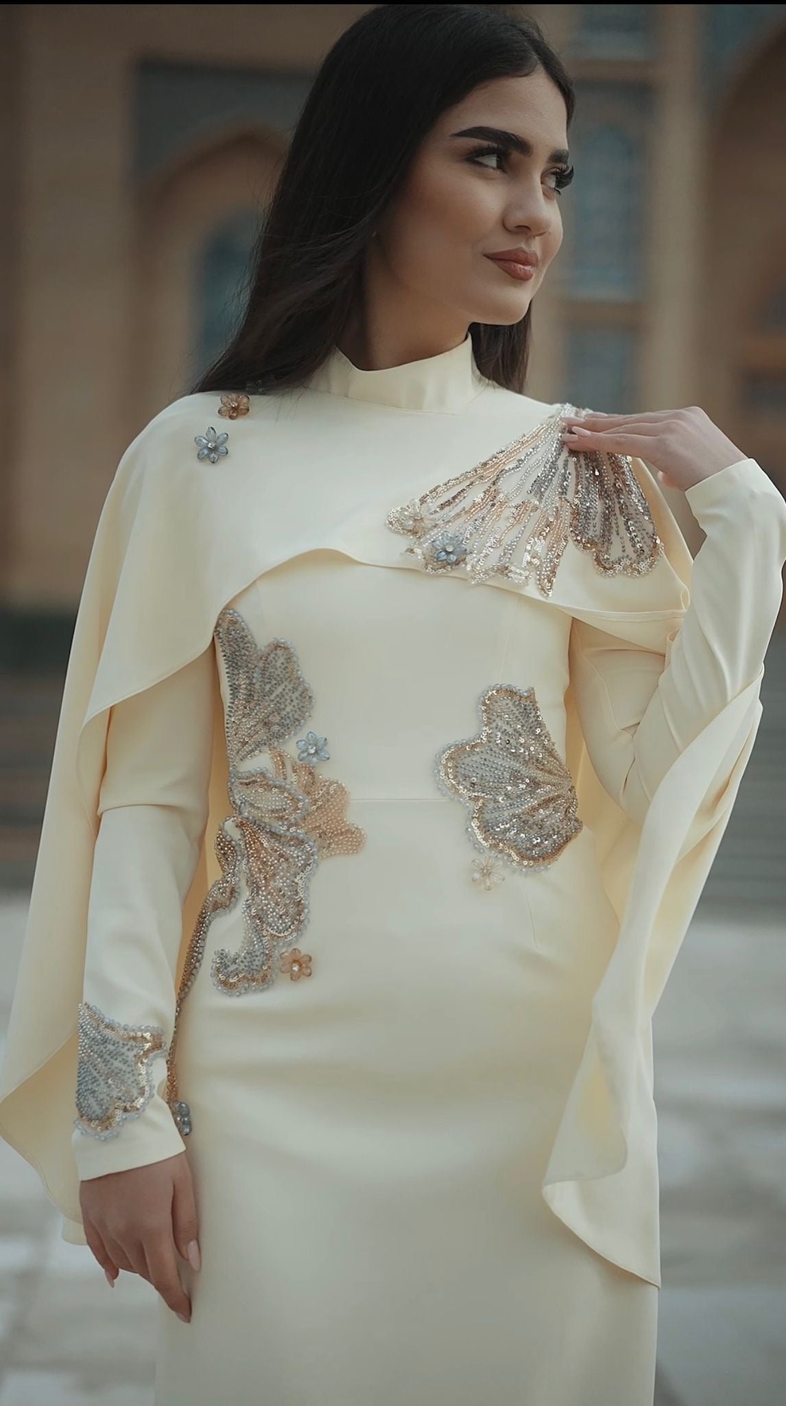 Vücuda kusursuz uyum sağlayan özel kalıbı sayesinde feminen hatları zarifçe ortaya çıkaran Canan Abiye, akıcı ve premium kumaşıyla gün boyu konfor sunar. Yüksek yaka formu ve uzun etek kesimi, açık sarı rengin zarafetiyle birleşerek tasarımı hem modern hem de zamansız bir görünüme taşır. İnce işçilikle uygulanan işlemeler, elbiseyi couture bir duruşa kavuşturur.