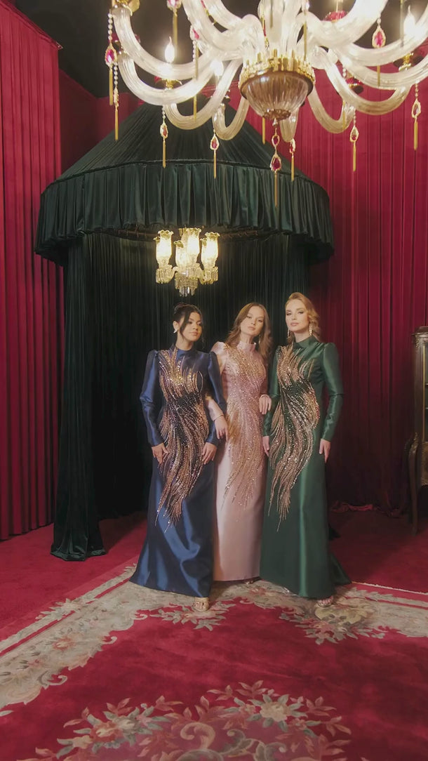 El işçiliğiyle işlenen her detay, özenle seçilmiş kumaşların narin dokunuşuyla birleşiyor. Güzelliğin en saf haliyle buluştuğu bu tasarım, sadece şıklığı değil, kalitenin ve estetiğin zarif bir yansımasını da sunuyor.