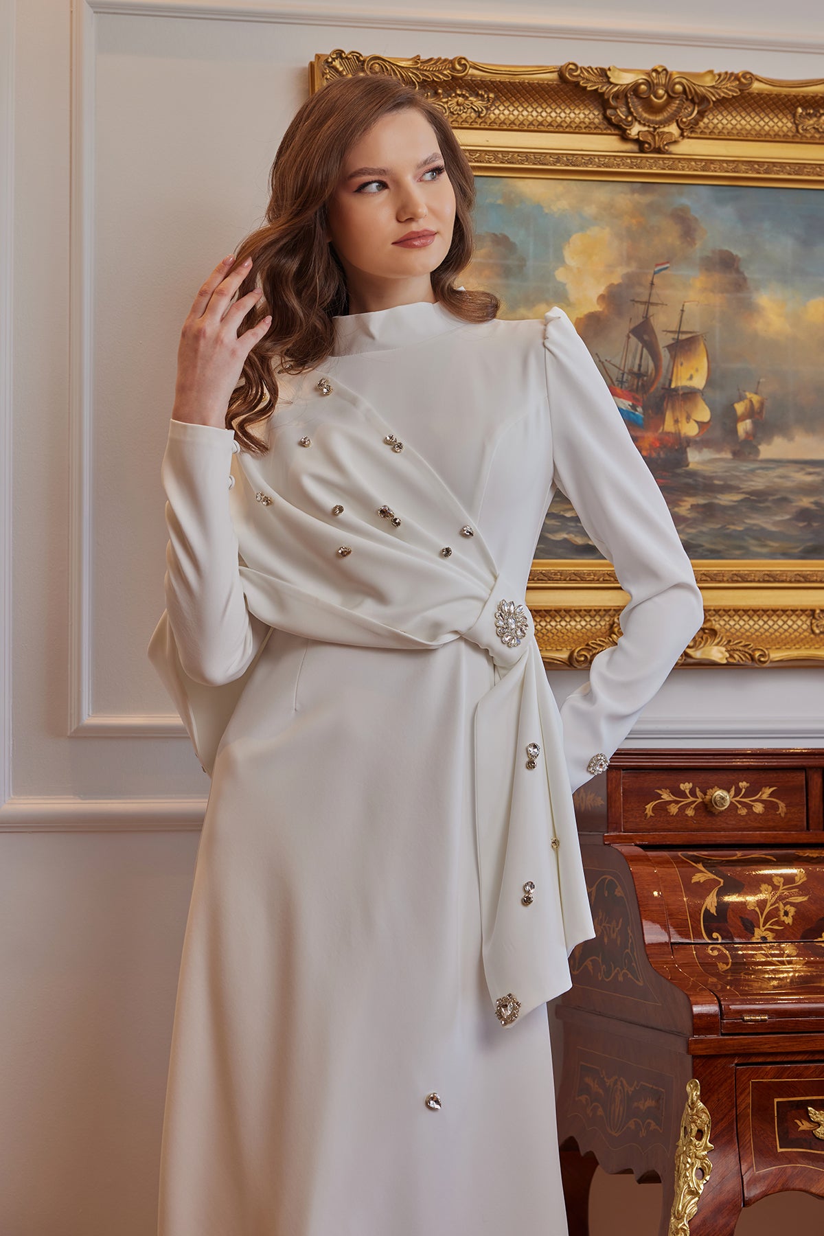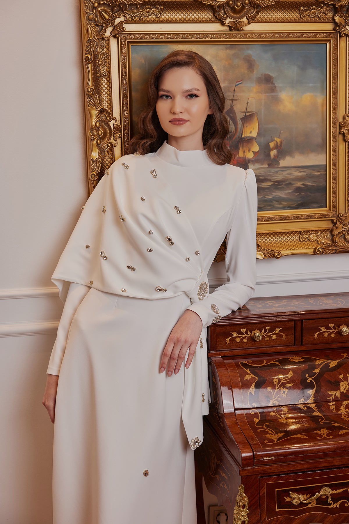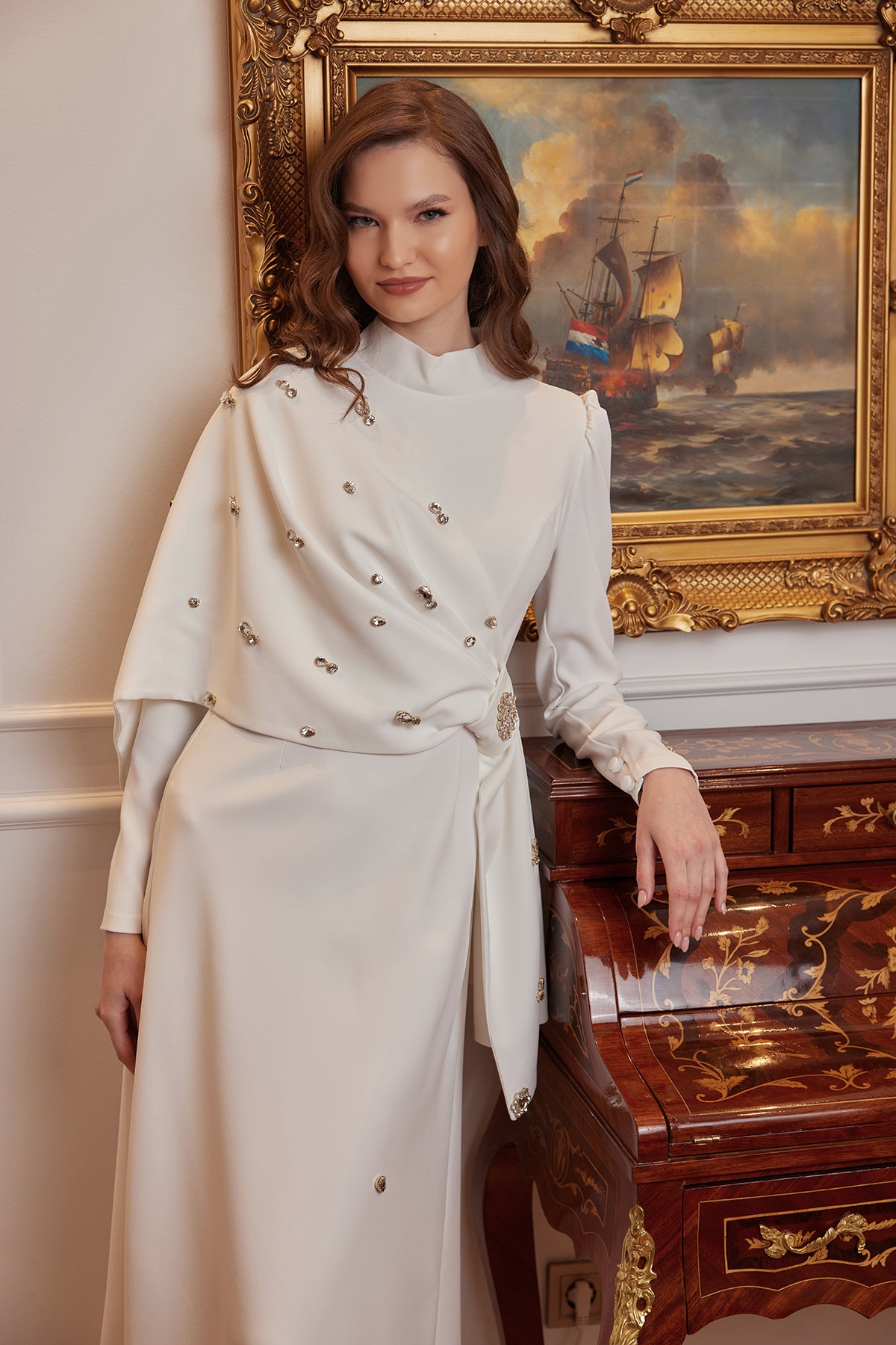 Nilda Abiye Ekru, My Dreams Collection’ın zarafet ve modern detayları bir araya getiren özel tasarımlarından biridir. Ekru tonunun doğal asaleti, elbisenin üzerine işlenen göz alıcı taş detaylarıyla buluşarak sofistike ve ışığı yansıtan bir görünüm sunar. Drapeli cape formundaki üst tasarım, bel bölümünde yer alan taşlı tokayla birleşerek modelin siluetini güçlü ve akıcı bir şekilde ortaya çıkarır.