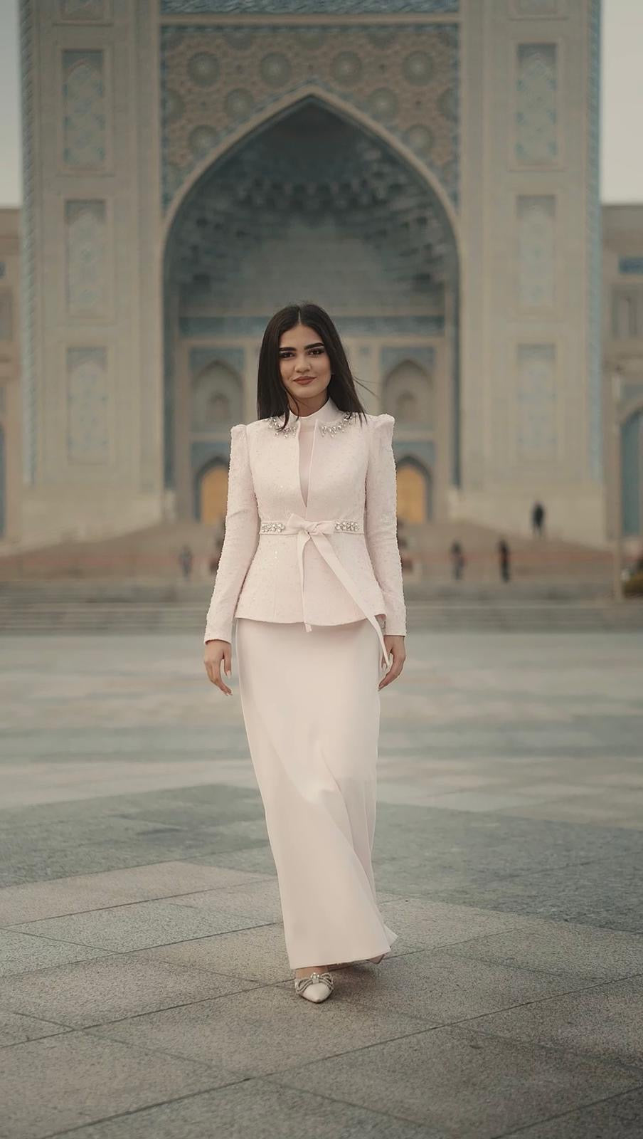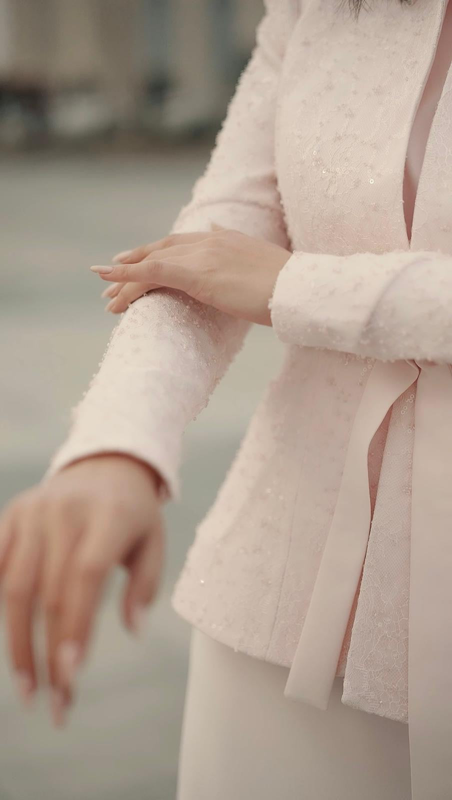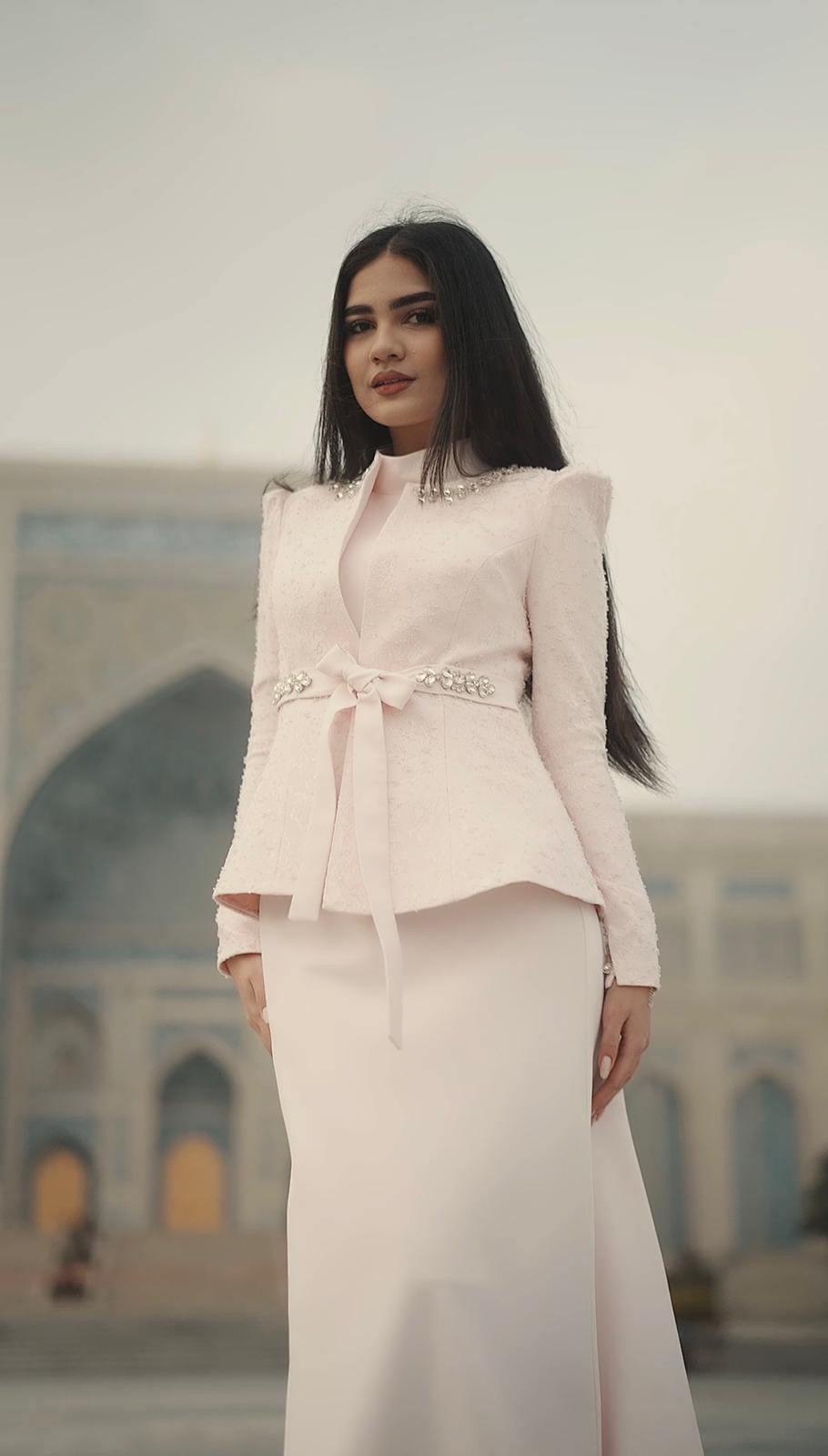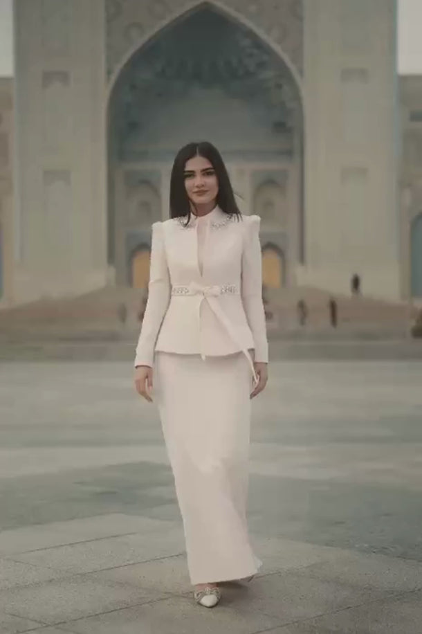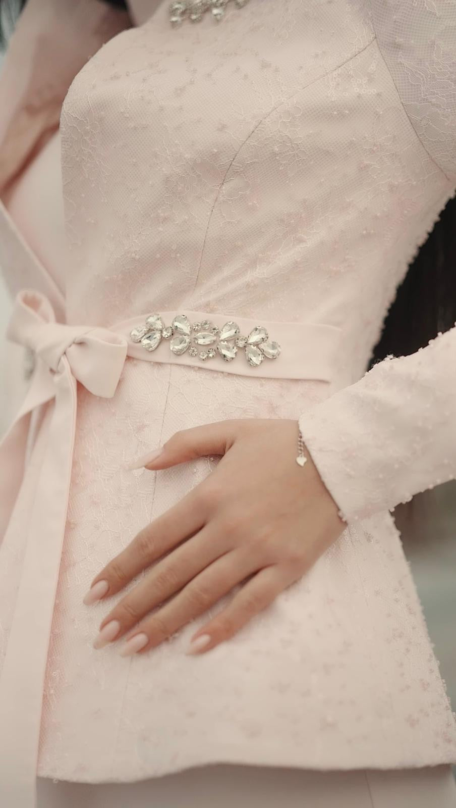 Nora Takım Pudra, modern çizgileri romantik detaylarla buluşturan, zamansız bir şıklık sunan özel bir tasarımdır. Pudra tonunun yumuşak ve feminen etkisi; ince dokuya sahip kumaş ve zarif taş işlemeleriyle birleşerek son derece sofistike bir görünüm oluşturur. Üst parçada yer alan ince işçilikli detaylar ve omuz hattındaki zarif taş süslemeleri, tasarıma couture bir dokunuş kazandırır.