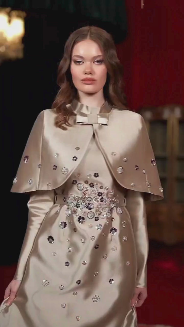 El işçiliğiyle işlenen her detay, özenle seçilmiş kumaşların narin dokunuşuyla birleşiyor. Güzelliğin en saf haliyle buluştuğu bu tasarım, sadece şıklığı değil, kalitenin ve estetiğin zarif bir yansımasını da sunuyor.