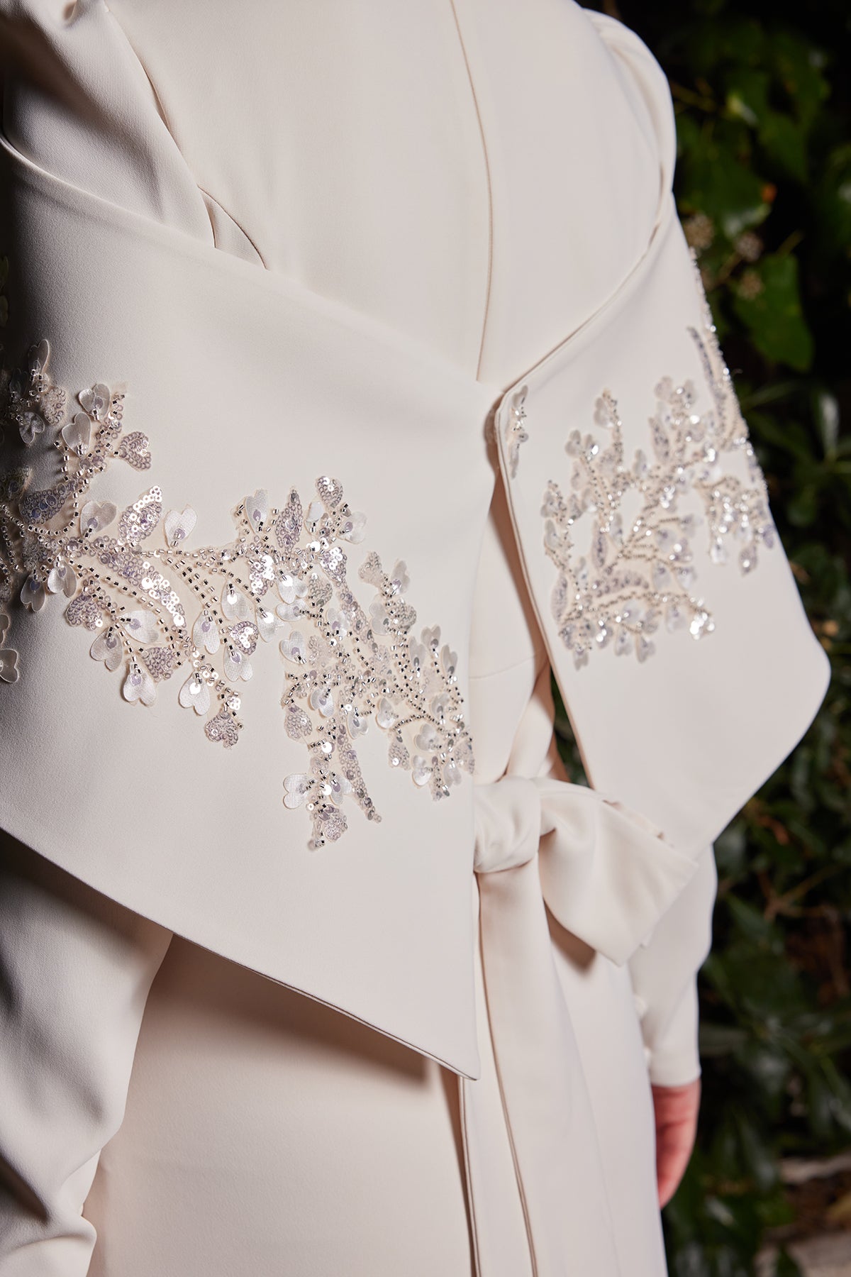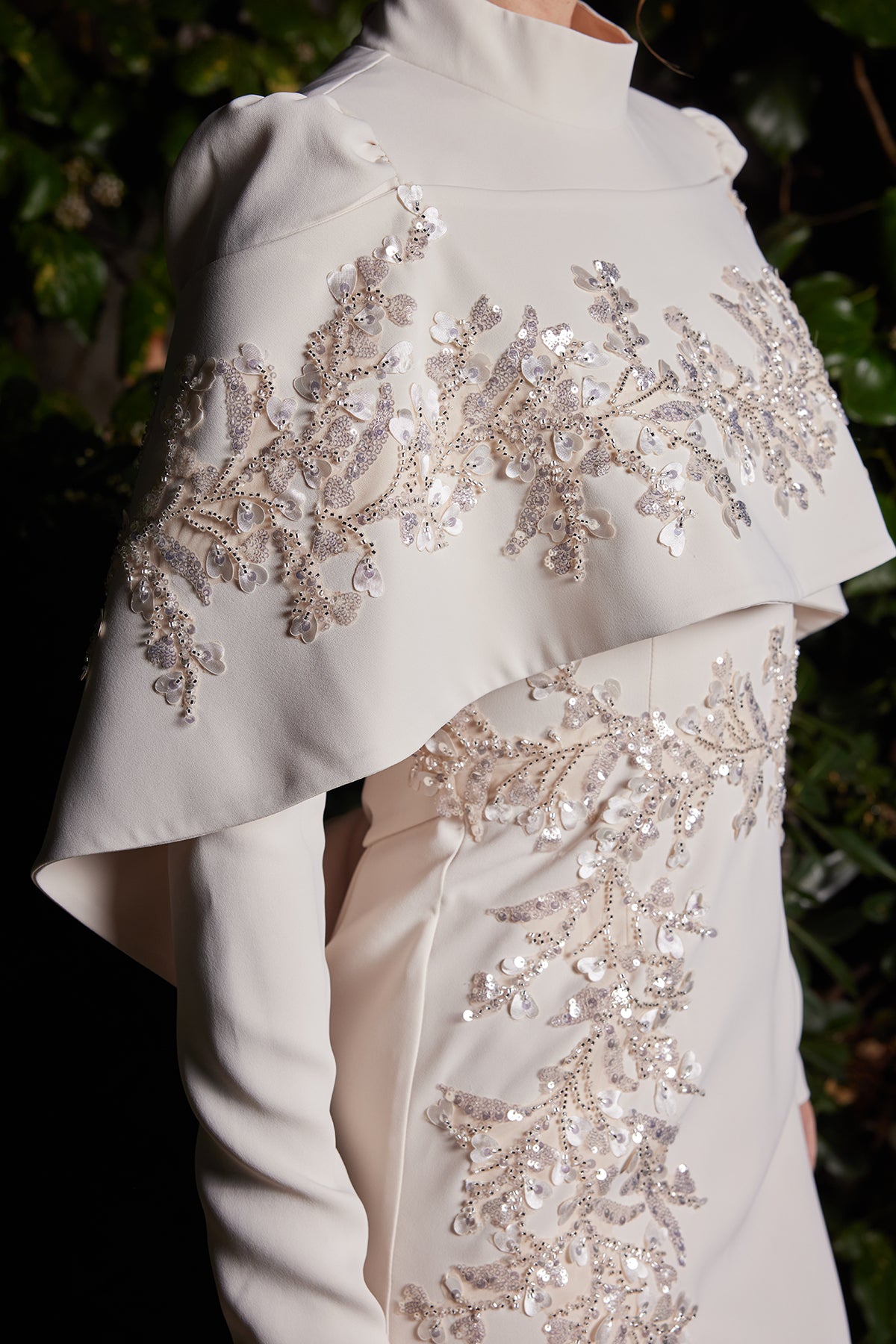 Abiye elbisenin vücuda oturan özel kalıbı, siluetinizi zarifçe ortaya çıkarırken omuzdan aşağı dökülen cape detayı tasarıma güçlü bir karakter kazandırır. Üzerindeki el emeği işlemeli motifler, ışığı mükemmel şekilde yansıtarak gece boyunca ışıltısını kaybetmeyen etkileyici bir görünüm oluşturur. Kaliteli kumaş dokusu ve detaylardaki ince işçilik, modelin şıklığını ilk bakışta fark ettirir.