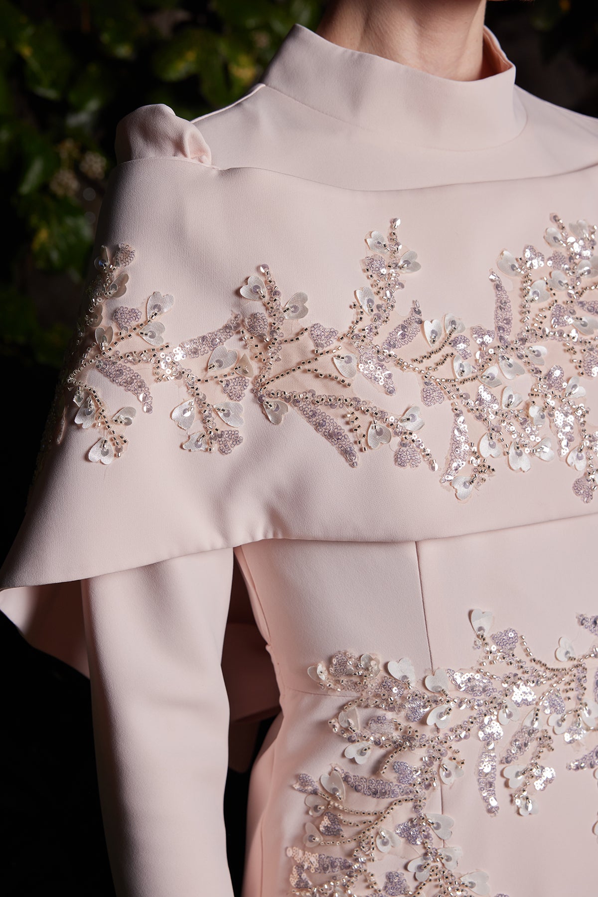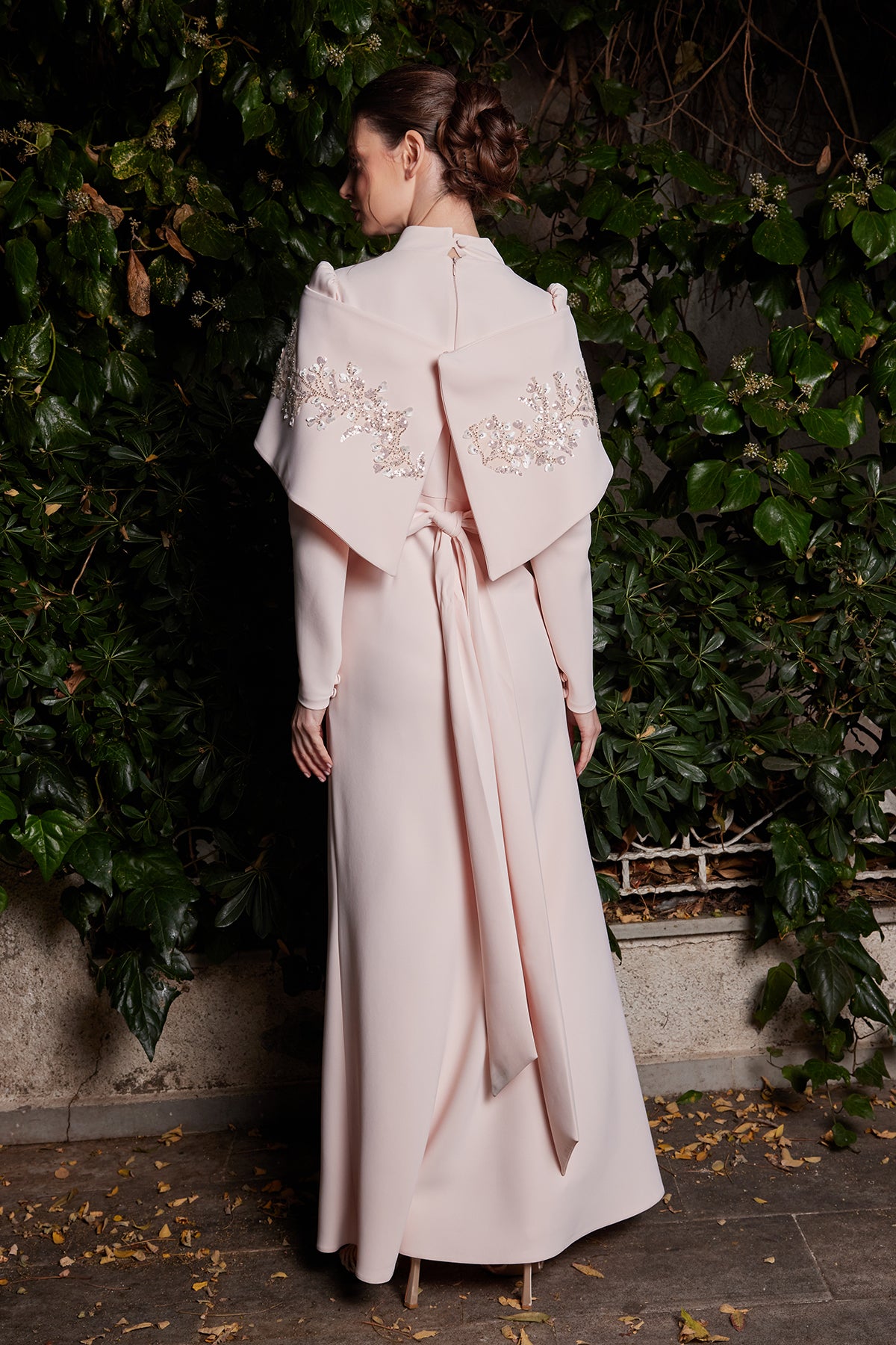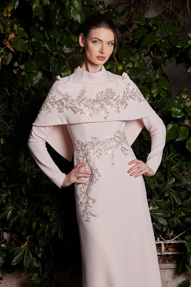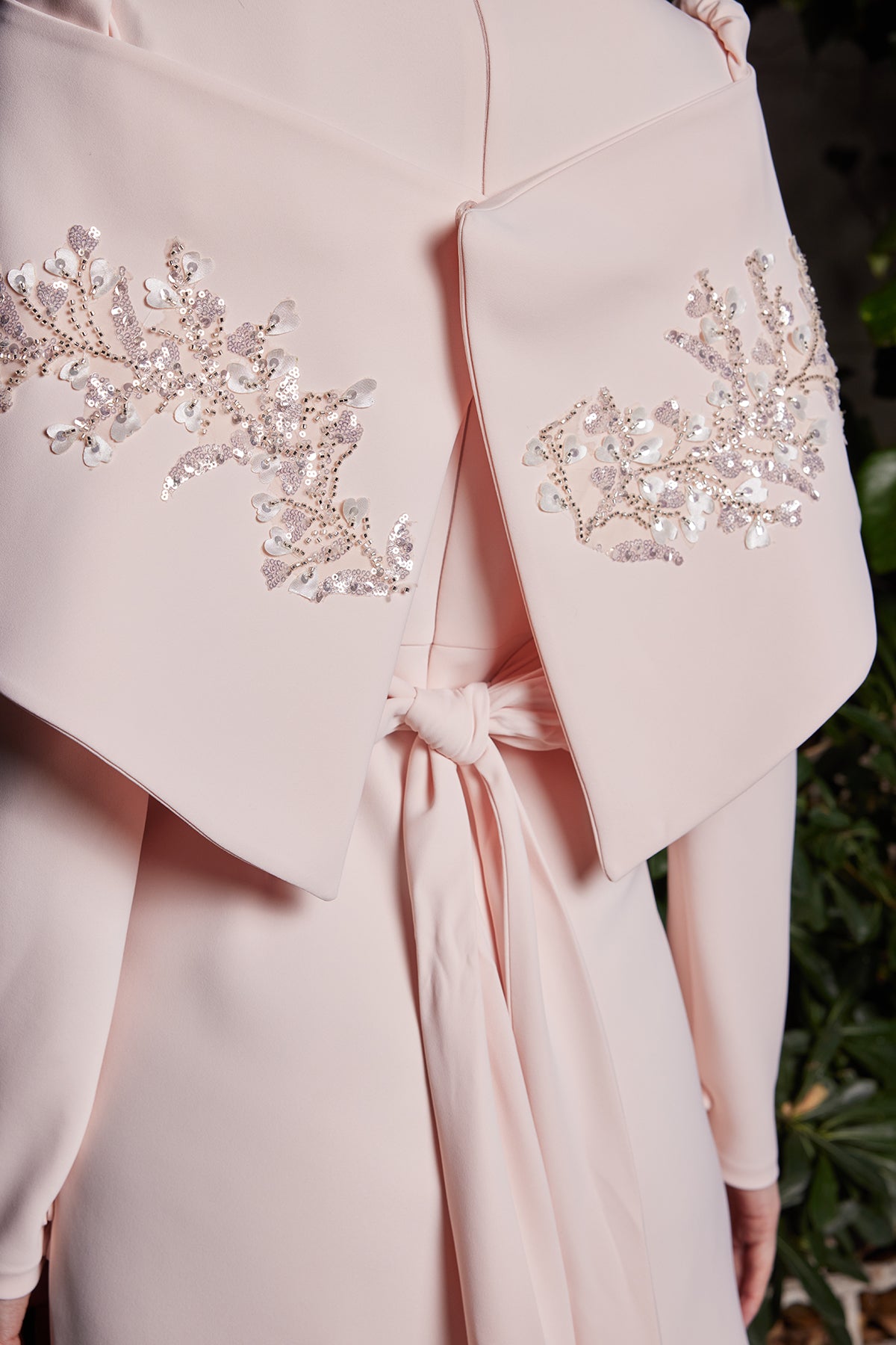 Abiye elbisenin vücuda oturan özel kalıbı, siluetinizi zarifçe ortaya çıkarırken omuzdan aşağı dökülen cape detayı tasarıma güçlü bir karakter kazandırır. Üzerindeki el emeği işlemeli motifler, ışığı etkileyici şekilde yansıtarak gece boyunca ışıltısını kaybetmeyen dikkat çekici bir görünüm oluşturur. Kaliteli kumaş dokusu ve detaylardaki ince işçilik, modelin şıklığını ilk bakışta hemen fark ettirir.