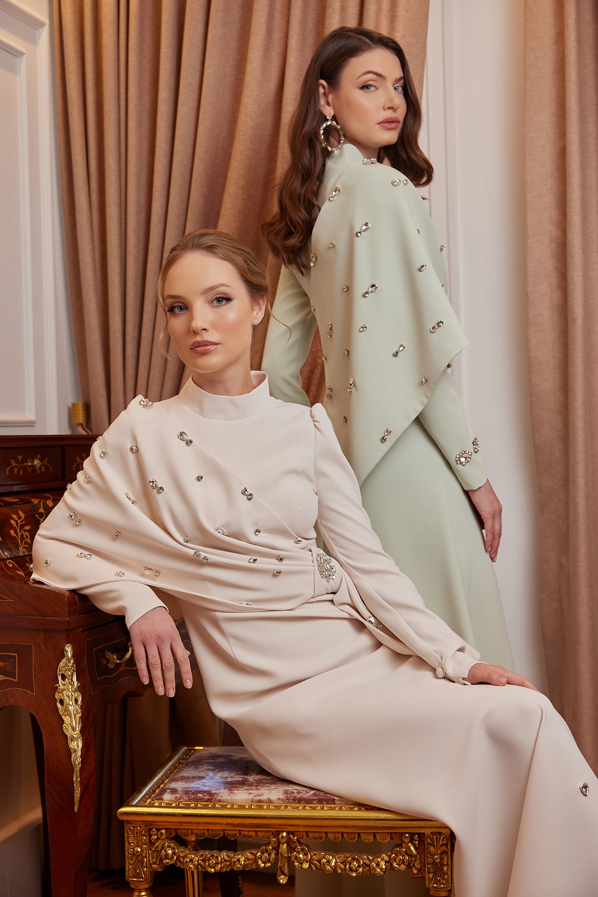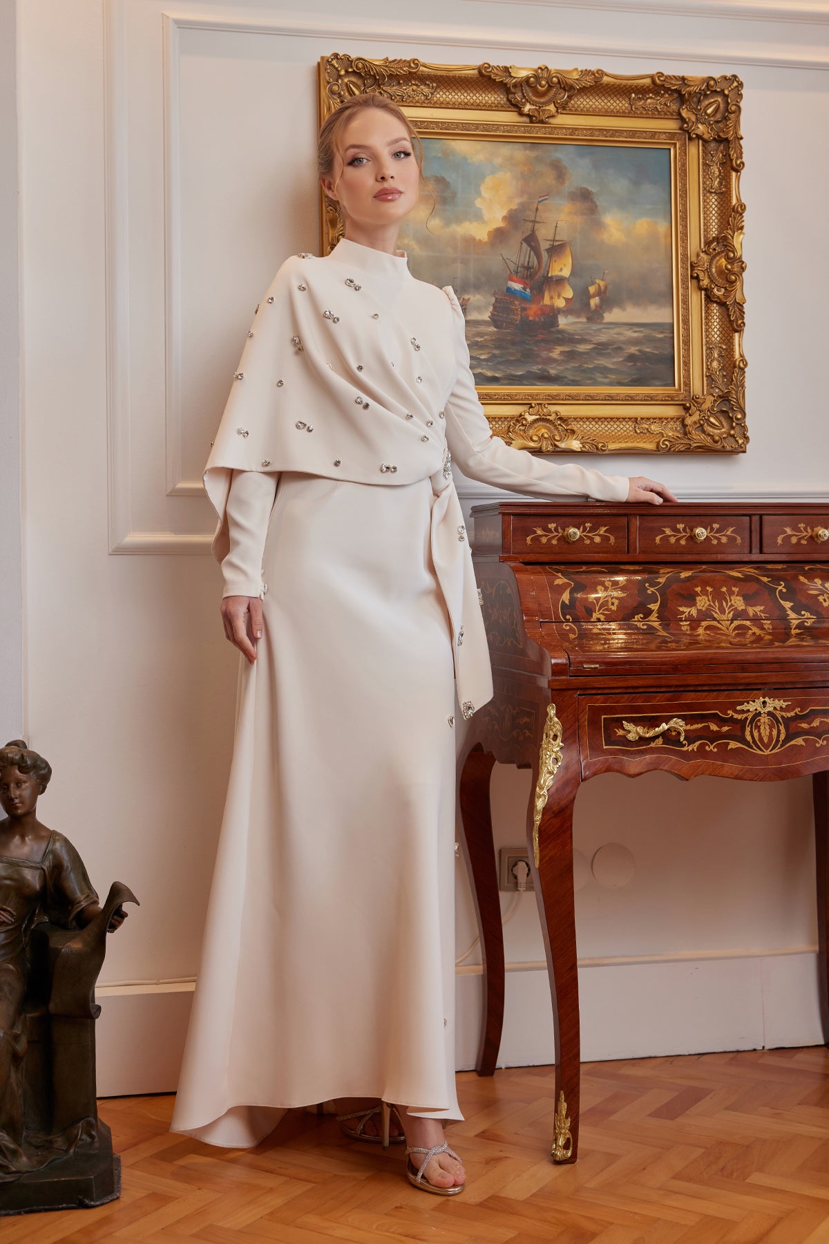 Modelin omuzdan aşağı akışla tamamlanan asimetrik pelerini, tasarıma couture bir hava katarken aynı zamanda kusursuz bir drape etkisi sunar. Pelerinin üzerinde yer alan ışıltılı taş detayları, elbisenin her açıdan parlamasını sağlarken bel bölümünde kullanılan büyük taş tokası, siluetin zarifçe vurgulanmasına yardımcı olur. Bu özel detaylar, modelin premium işçiliğini ve özenli tasarım sürecini açıkça yansıtır.