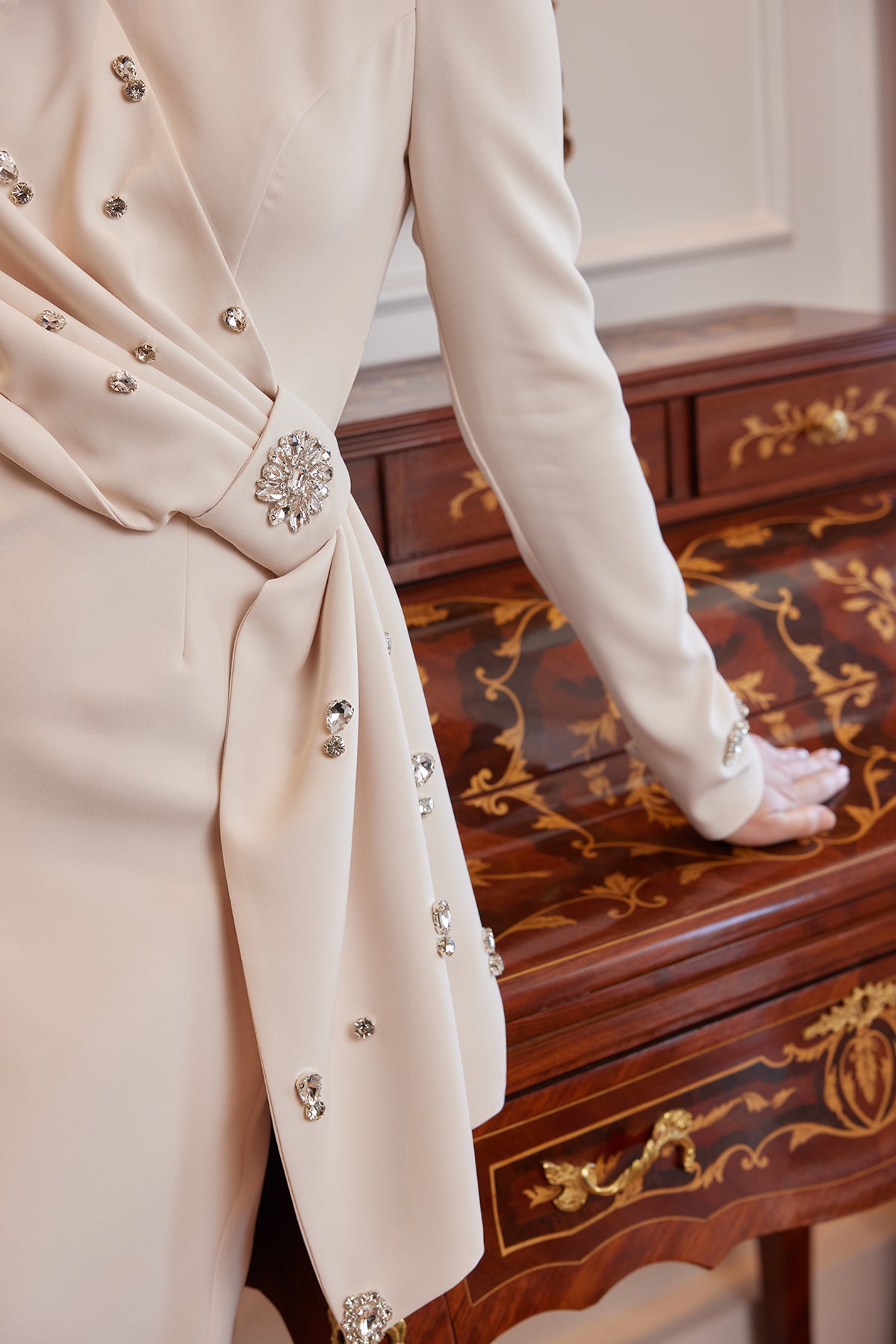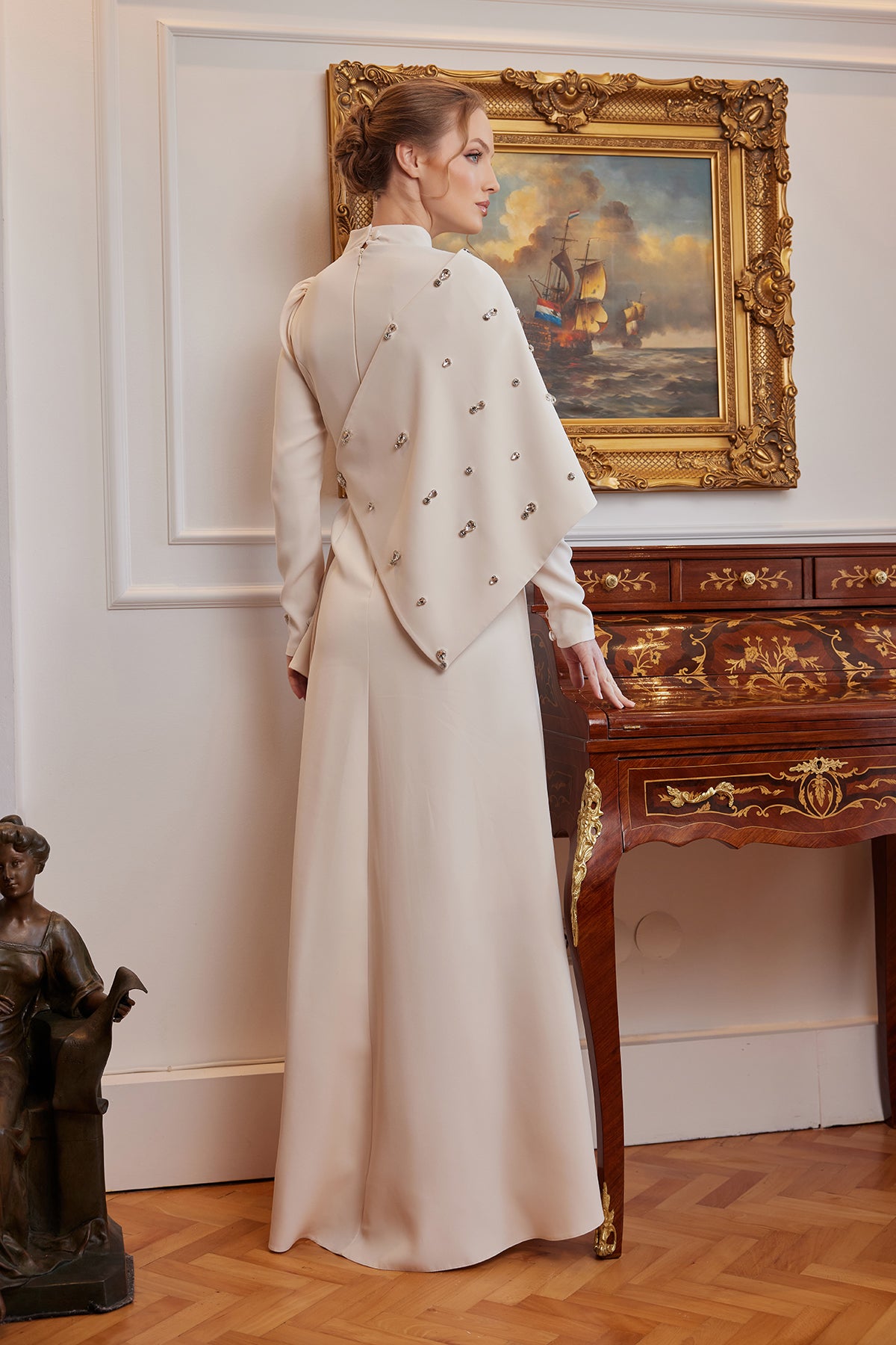Modern zarafet ile işlenmiş detayları bir araya getiren Nilda Abiye Bej, My Dreams Collection’ın öne çıkan özel tasarımlarından biridir.