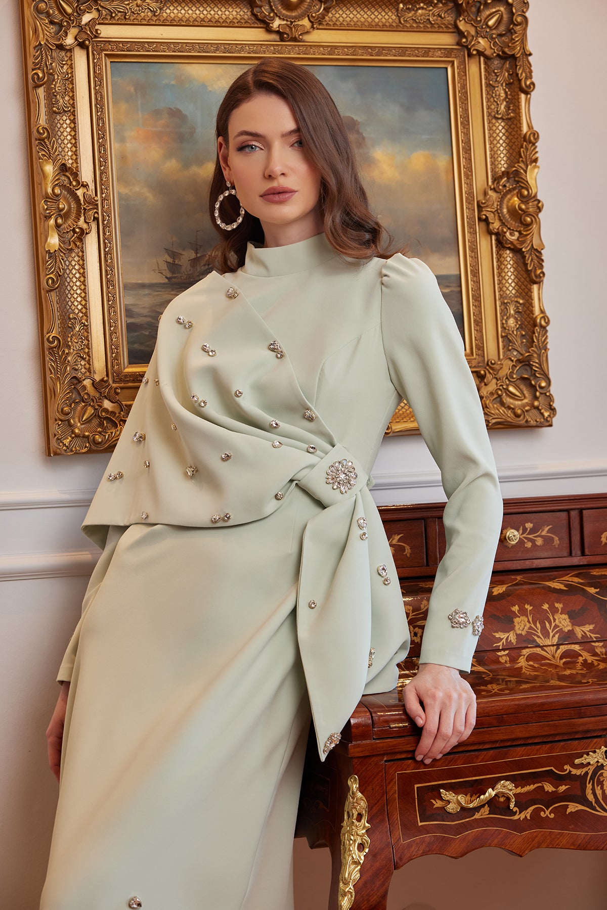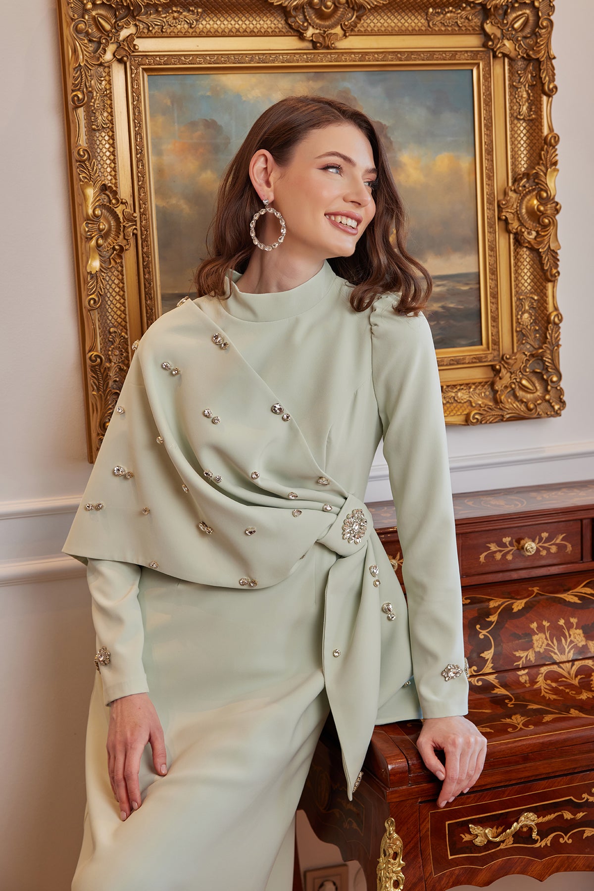 Büyük beden seçenekleriyle herkes için ulaşılabilir bir şıklık sunan Nilda Abiye Mint; söz, nişan, düğün ve tüm özel davetlerde zarif bir iz bırakmak isteyenler için ideal bir seçimdir. Fotoğraf karelerinde derinlik ve ışık etkisini mükemmel yansıtan mint tonu, tüm bakışları üzerinizde toplar.