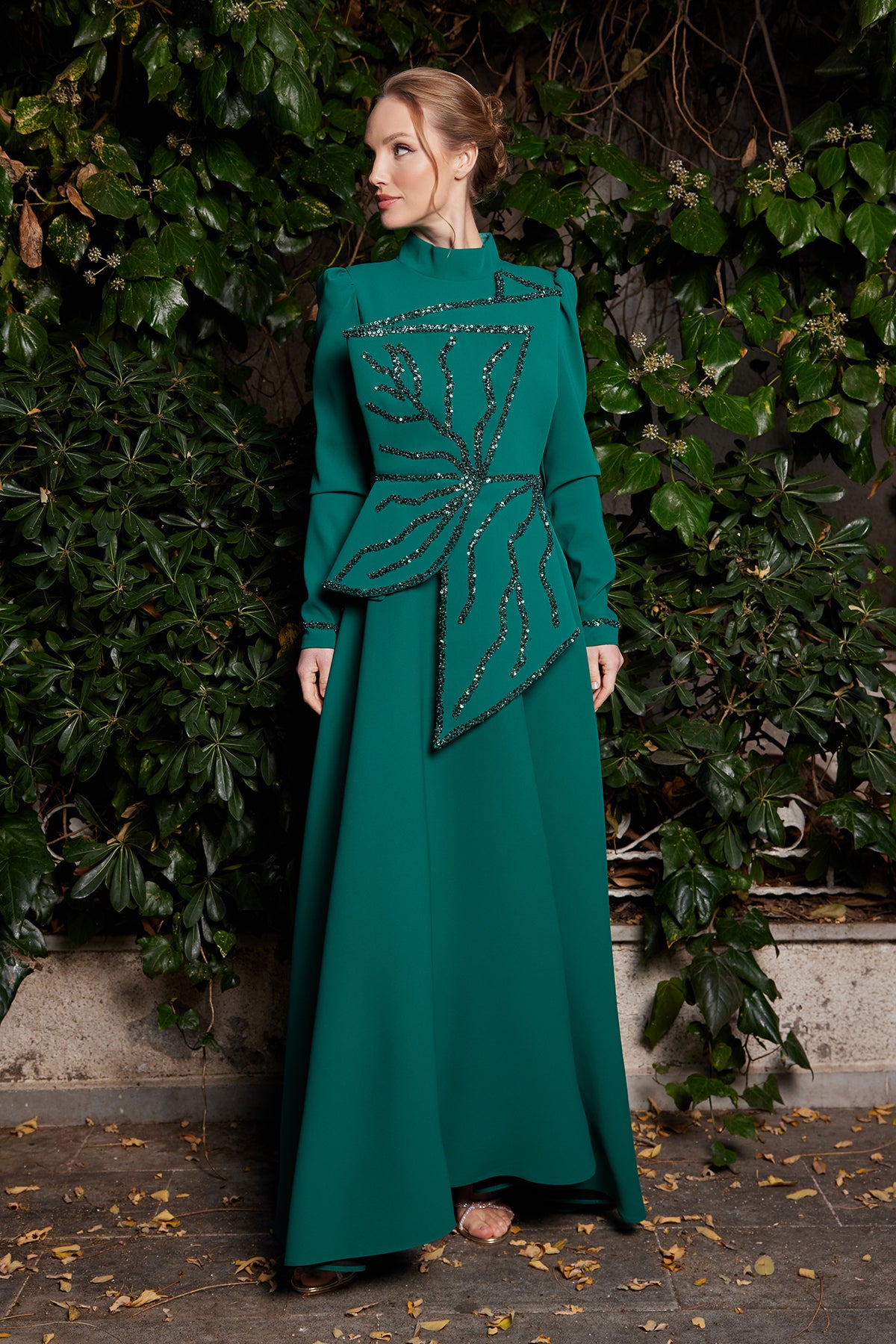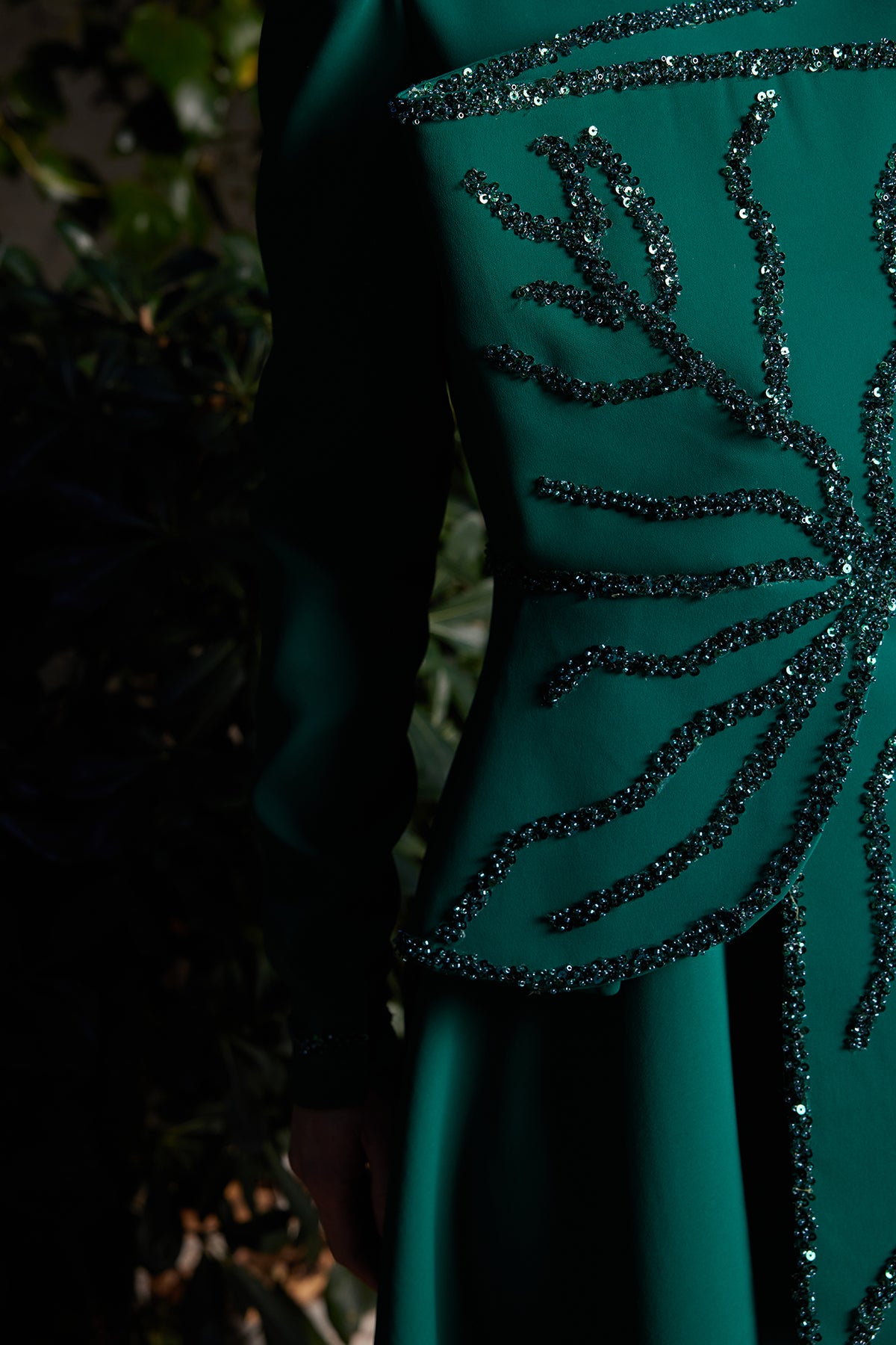 Sırma Abiye Zümrüt, My Dreams Collection’ın modern çizgilerini dikkat çekici detaylarla buluşturan özel bir tasarımdır. Zümrüt renginin güçlü ve derin tonu, elbisenin üzerine özenle yerleştirilen ışıltılı işlemelerle tamamlanarak hem sanatsal hem de sofistike bir görünüm oluşturur. Vücudu zarifçe takip eden bu işlemeler, silueti daha dengeli gösterirken tasarımın özgün duruşunu ön plana çıkarır.