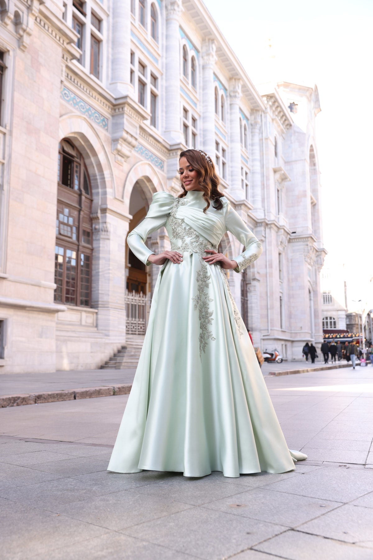 Our specially designed products are designed to make you feel special on your most special occasions. The Nadya Evening Dress will make you shine like a star with its sparkling embroidery on special occasions like weddings, engagements, henna nights, proms, and graduations. Its silky lining will make you feel incredibly comfortable. Available in Burgundy, Mint, Powder, and Gray.