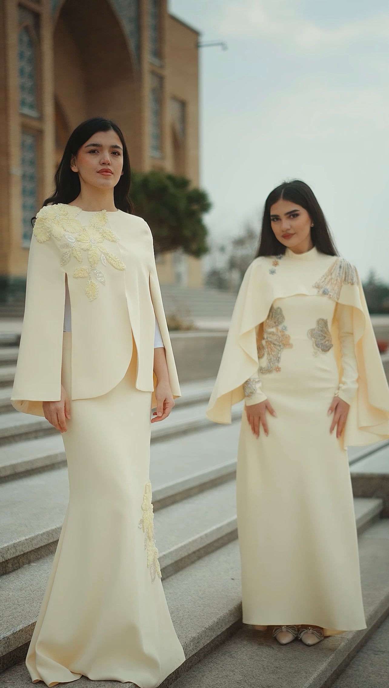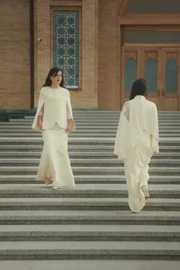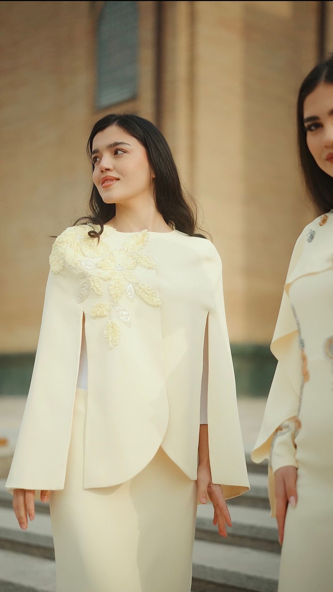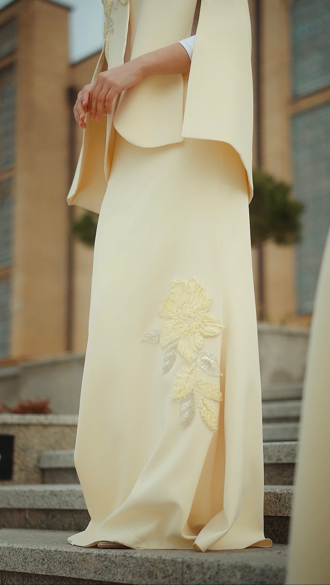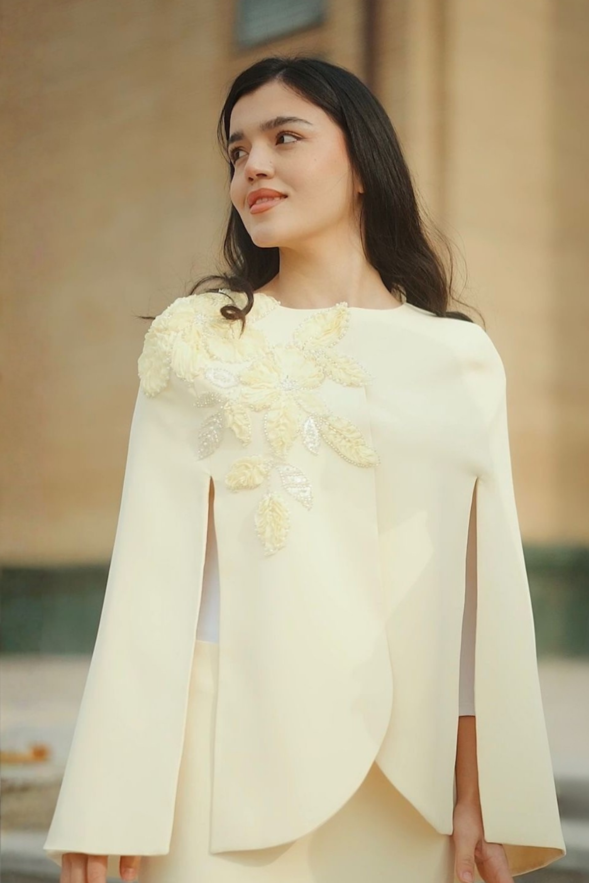 Düşes Abiye açık sarı rengiyle zarafeti ve asaleti kusursuz bir dengede buluşturan özel bir tasarımdır. Soft açık sarı tonunun verdiği aydınlık ve ferah etki, elbiseye son derece zarif bir görünüm kazandırırken; omuz ve etek kısmında yer alan üç boyutlu çiçek aplikeleri ile ince işlemeler tasarımı göz alıcı bir noktaya taşır. Pelerin formundaki üst detay, modele akıcı bir hareket ve modern bir duruş kazandırır.