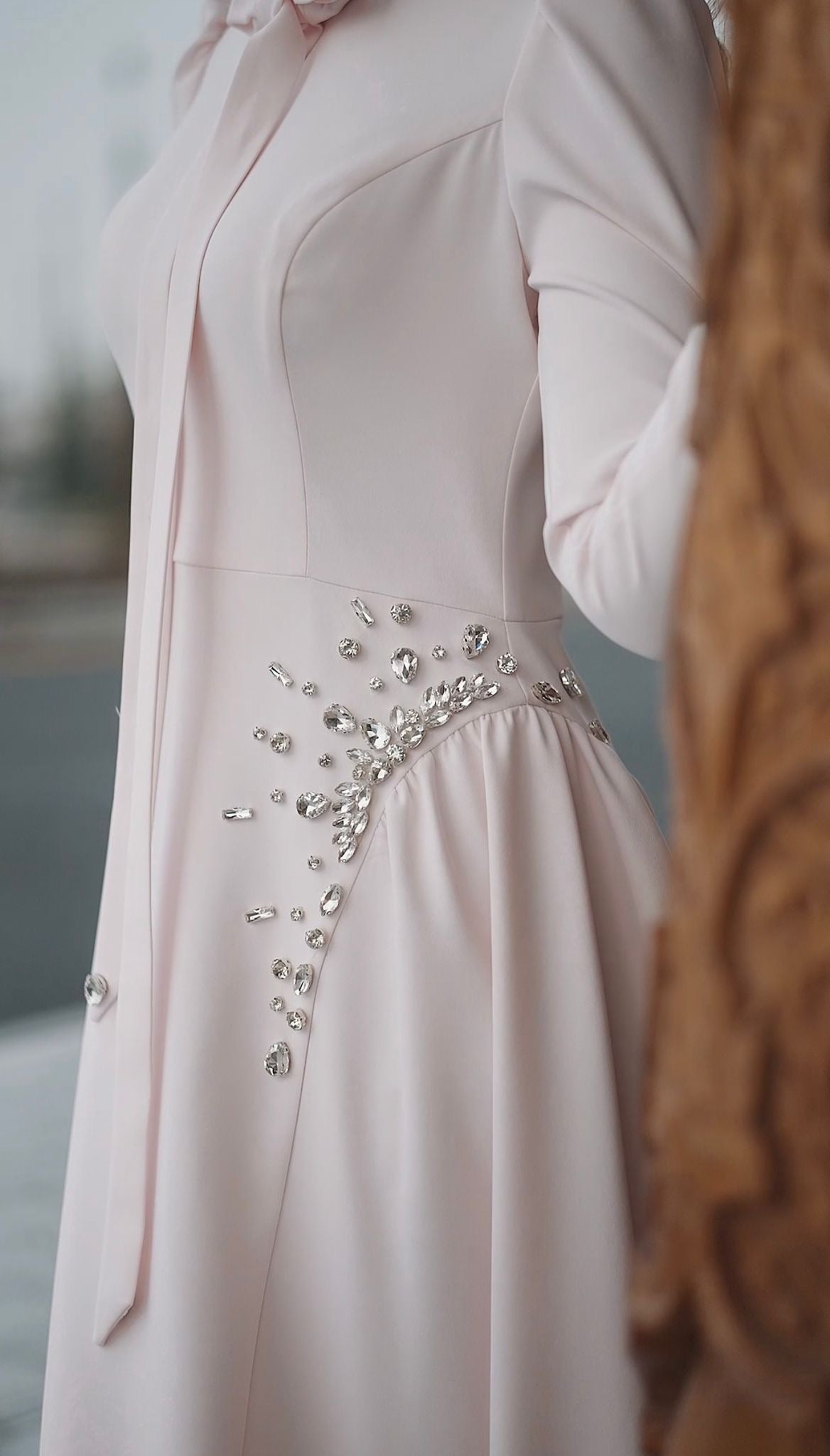 Talia Abiye Açık Pudra, modern şıklığı romantik bir zarafetle buluşturan özel tasarımıyla sofistike bir duruş sunuyor. Gövde kısmındaki zarif drapeler ve ışığı yumuşak bir ışıltıyla yansıtan taş işlemeleri, elbiseye hem seçkin hem de feminen bir karakter kazandırıyor. İnce işçilikle tek tek yerleştirilen taş detayları, modeli adeta couture bir parça haline getiriyor.